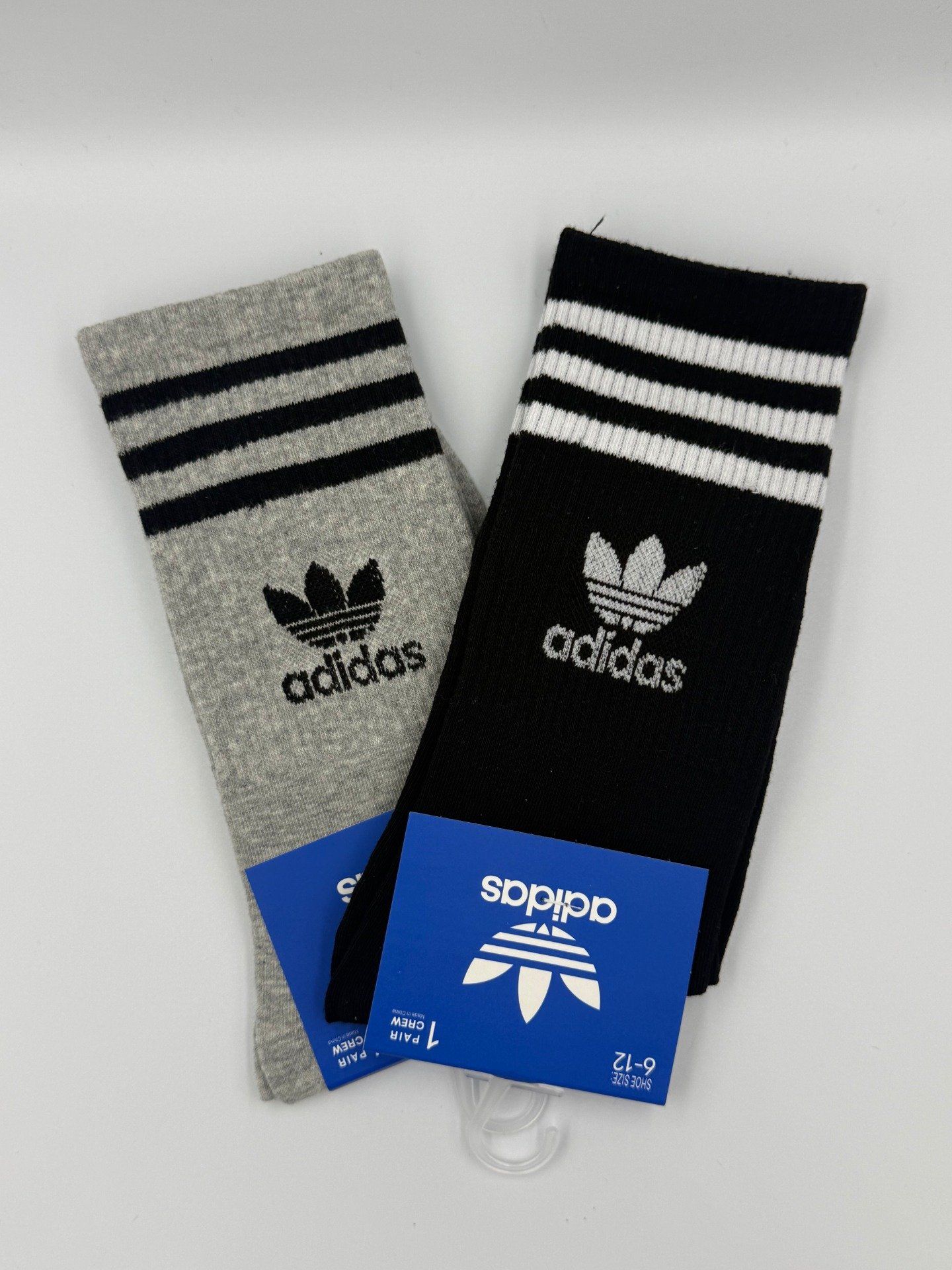 Paire de chaussettes Adidas montantes noir et gris avec logo iconique et bandes Adidas. Style streetwear confortable et tendance, parfait pour le sport ou le quotidien.