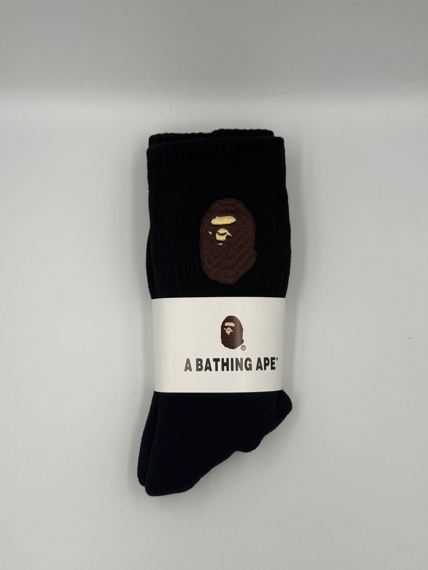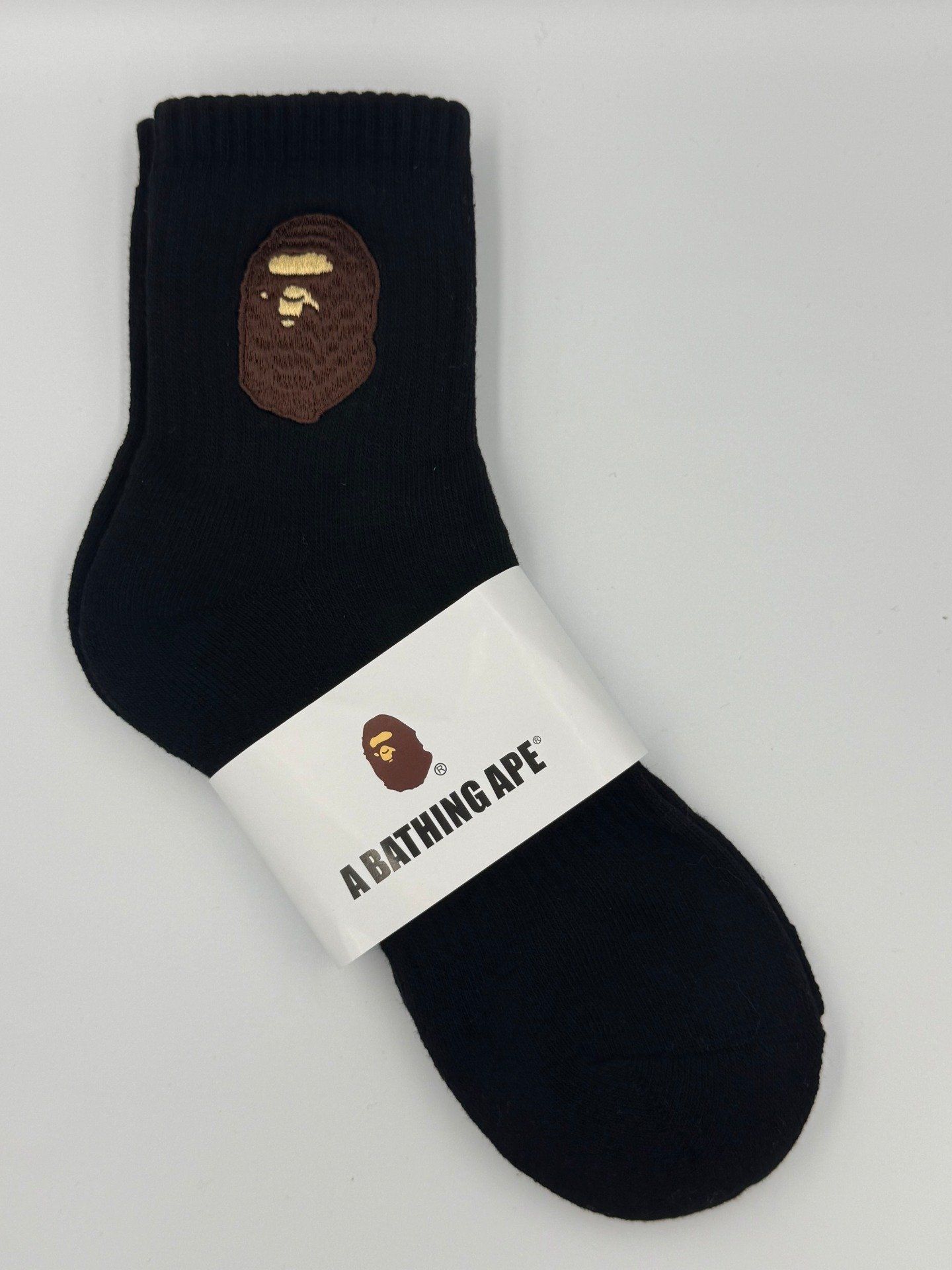 Ce modèle met en avant le célèbre logo Ape Head brodé marron, symbole iconique de la marque BAPE. Le contraste entre les chaussettes noires et blanches apporte un style minimaliste et tendance, parfait pour compléter une tenue streetwear.