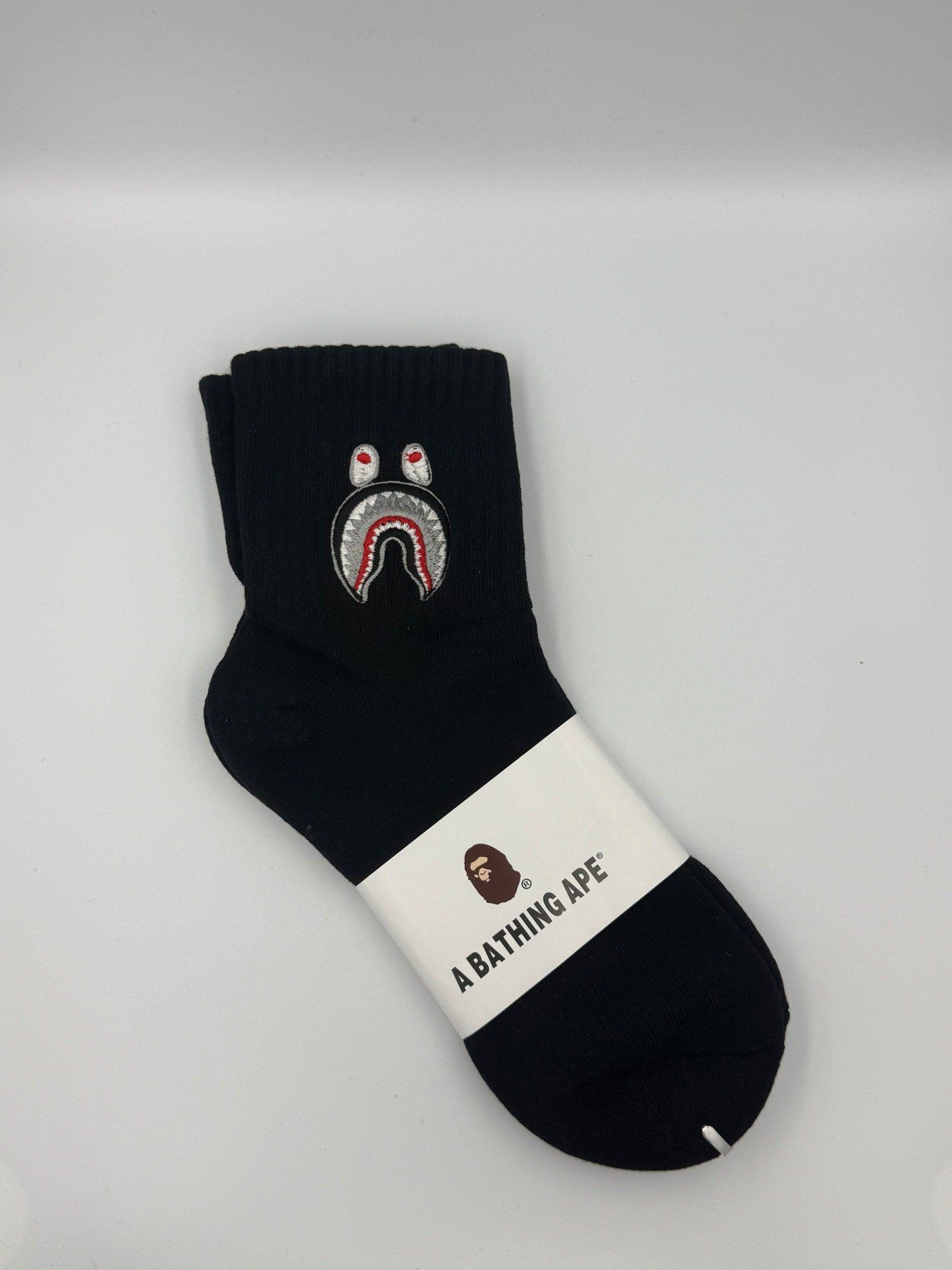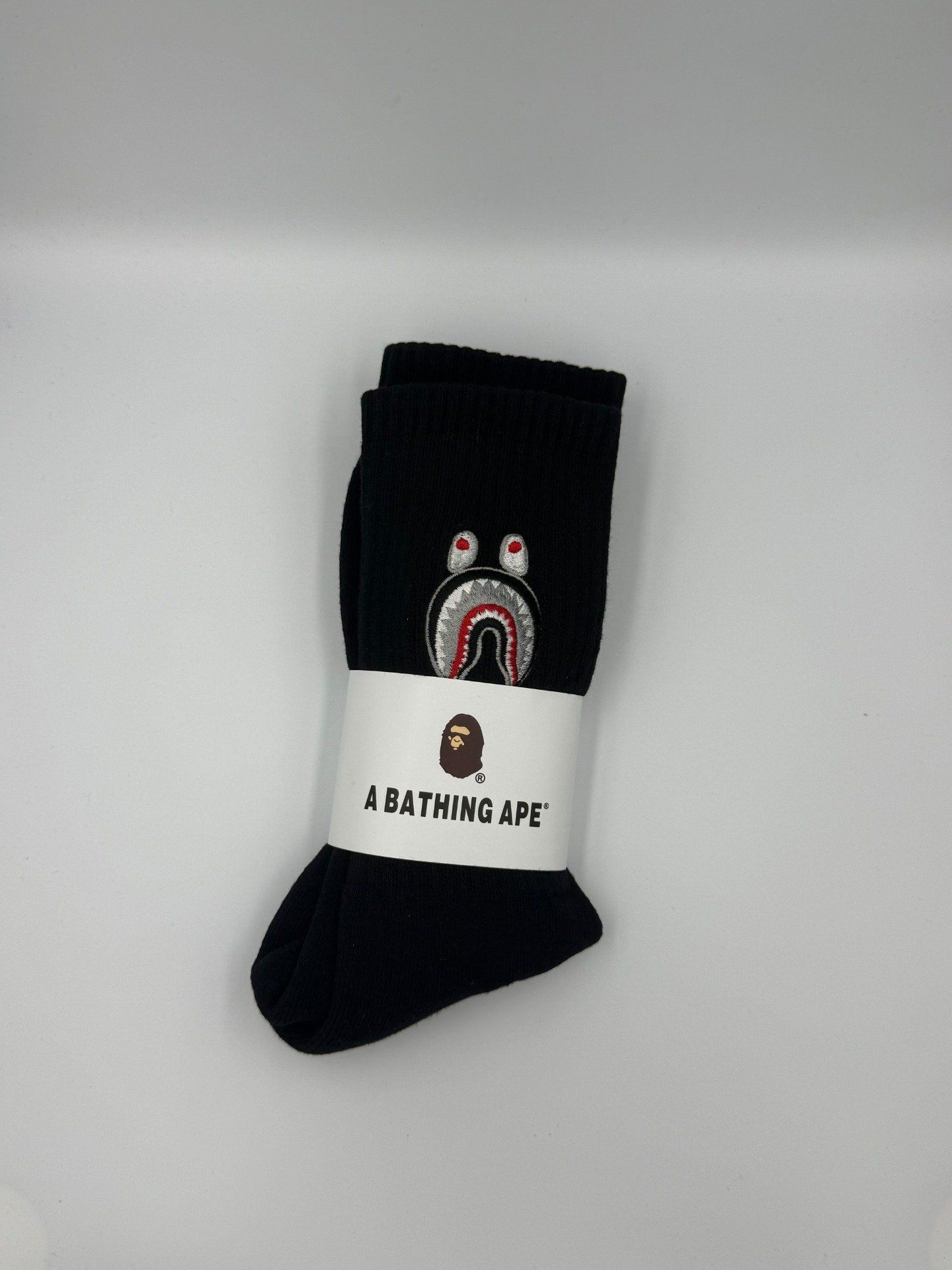 Chaussettes BAPE Shark noires et blanches de la marque A Bathing Ape. Style streetwear iconique, confortables et respirantes. Parfaites avec sneakers et tenues urbaines. Modèle unisexe homme et femme.