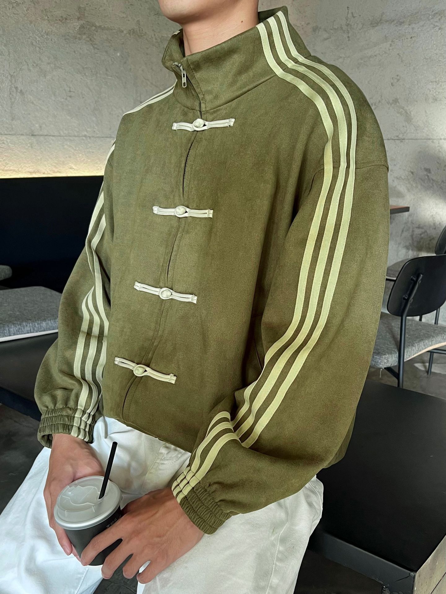 Veste Adidas Nouvel An Chinois vert olive en daim au style streetwear unique. Inspirée de la culture asiatique avec fermeture traditionnelle chinoise et bandes Adidas iconiques. Confort et style original.